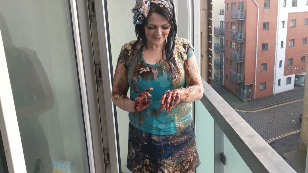 Emma walks from the mess in her heels to the balcony. Emma stands outside and answers a few questions. Then a great view of Emma behind on way to shower.